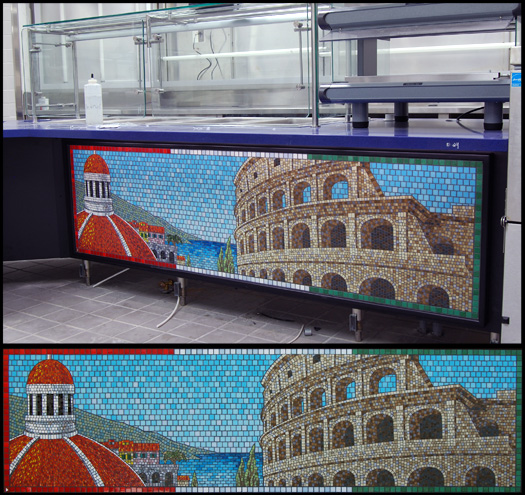 Notes: As part of cost saving, the Italian design created for the Lecanto High School Project was repurposed for Crystal River. The counter size changed from 16 feet to 6.5. Something had to change. By enlarging the red tiled duomo to balance out the presence of the Colosseum a new composition was possible while including almost all the elements of the original design.